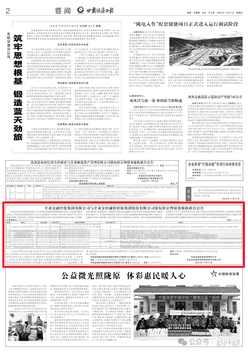 开云官网首页(中国)集团有限公司与甘肃金控融资担保集团股份有限公司债权转让暨债务催收联合公告